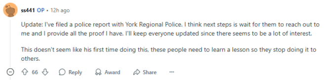 不过,帖主随后更新说:“我已经向约克区警察局报案了。我想接下来就是等他们联系我,我会提供我掌握的所有证据。我会及时向大家通报最新情况,因为看起来大家对此很感兴趣。”