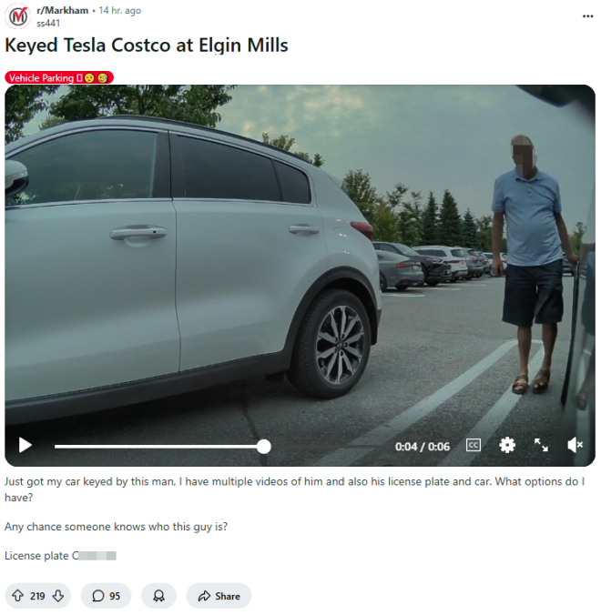 近日,一位网友在Reddit论坛上爆料称,在列治文山Elgin Mills的Costco停车场,自己的特斯拉被人无缘无故用钥匙划伤。