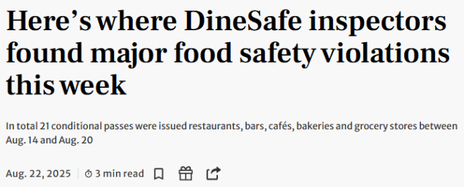 根据多伦多公共局DineSafe系统发布的最新一周食品安全检查结果,8月14日至20日,共有21家餐厅被给予“有条件通过(Conditional Pass)”评级,其中不乏华人熟悉的中餐厅和连锁品牌。
