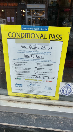 “有条件通过”(Conditional Pass)是多伦多食品安全检查中的警告等级之一。当餐厅存在至少一项重大违规(Major Infraction),对公众健康构成风险时,将被评为“有条件通过”,并在48小时内强制进行复查。如果违规行为更严重,还可能会被立即勒令停业。未能遵守多伦多的DineSafe计划可能会导致罚款、法庭传票和其他执法行动。