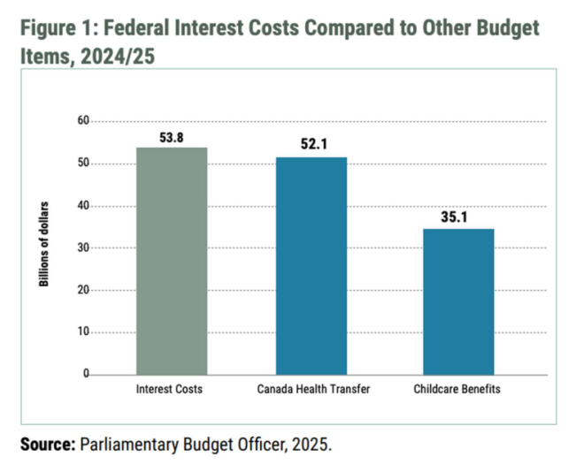 根据报告,渥太华在2024/2025年度将花费538亿加元用于偿付债务利息,这一数字明显高于政府预计在“加拿大儿童福利”和“全国早期学习与托育福利”上的支出(351亿加元)。这笔钱甚至超过了联邦政府向各省支付的“加拿大医疗转移金”(521亿加元)。