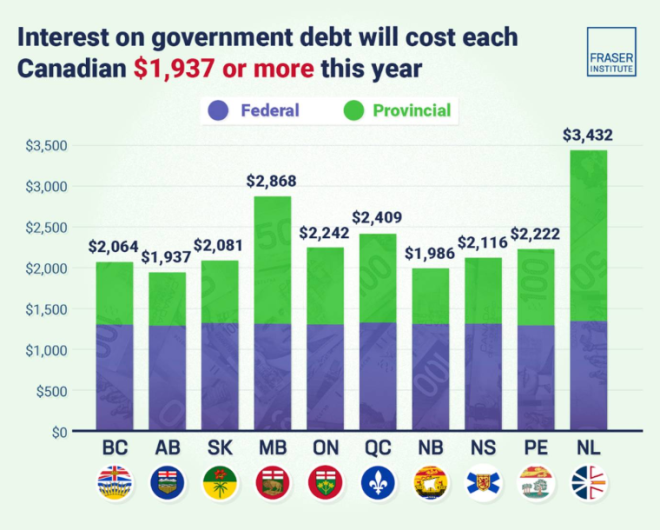 公共政策智库菲沙研究所发现,加拿大联邦政府和省级政府的债务利息总额将在2024/2025年度达到925亿加元。折合下来,每位加拿大人需要承担1,937至3,432加元的债务利息,具体金额取决于所在省份。