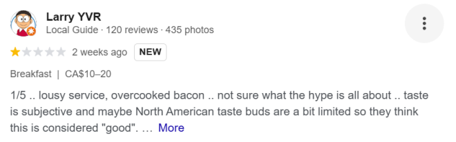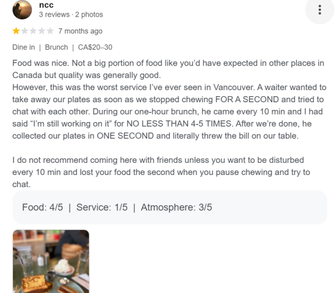 再往下看,关于服务差的评论其实很多,比如这位网友表示“饭菜不错,但服务可能是整个温哥华最糟糕的,服务员非常不上心、效率很低、有的时候还很粗鲁。”