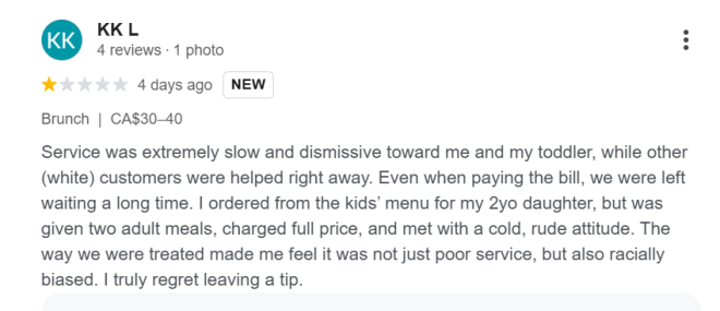 这位网友的抱怨是来自于服务:服务很慢,完全无视她和她年幼的孩子,但服务其他人很积极,哪怕是付钱的时候也等了很久很久。