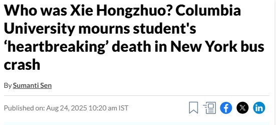 上周五(8月22日)下午,从尼亚加拉大瀑布返回纽约州的一辆旅游大巴发生,造成五人死亡,死者中包括三名,其中一人是来自中国北京的22岁哥伦比亚大学谢红卓(Hongzhuo Xie)。在即将开始攻读硕士学位之际,她的生命戛然而止。
