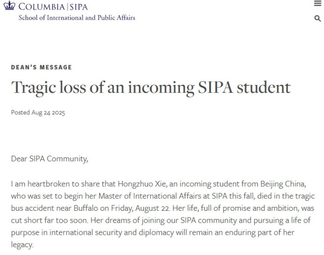 哥伦比亚大学国际与公共事务学院(SIPA)院长凯伦·亚尔希-米洛(Keren Yarhi-Milo) 在一份声明中,怀着沉痛的心情证实了这一消息。声明指出,谢红卓是该学院即将入学的新生,原定于今年秋季开始她的国际事务硕士课程。院长表示:“她的生命,充满希望和抱负,过早地逝去。她加入SIPA社区并在国际安全和外交领域追求有意义人生的梦想,将成为她留下的永恒遗产。”校方已与谢红卓的家人保持密切联系,并提供全力支持。