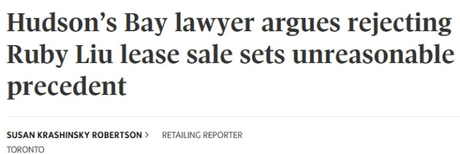 代表哈德逊湾的律师周四在庭审中称,如果法院拒绝批准将25家门店租约出售给刘伟宏的交易,将为未来类似破产案件中的租约转让树立“不合理的先例”。