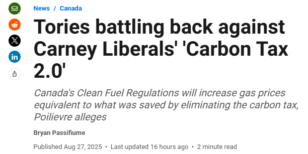 他声称,联邦政府的“清洁燃料法规”(CFR)将迫使加拿大人通过油价支付,把原本因碳税取消而省下的钱又交了回去。