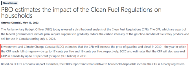 国会预算官(PBO)在报告中写道,加拿大环境与气候变化部(ECCC)估计,到 2030 年(即清洁燃料法规完全实施的年份),该法规将使汽油价格每升最高上涨17分,柴油价格每升最高上涨16分。