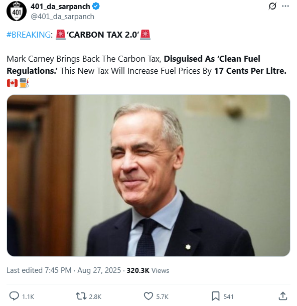 “那之前的碳税让你的汽油涨了多少钱?也是每升17分钱!新税看起来和旧税非常相似,马克·卡尼以为没人会注意到。”