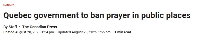 据加通社报道,省政府表示,计划在省内禁止在公共场所祈祷,此举是加强该省世俗化政策的一部分。