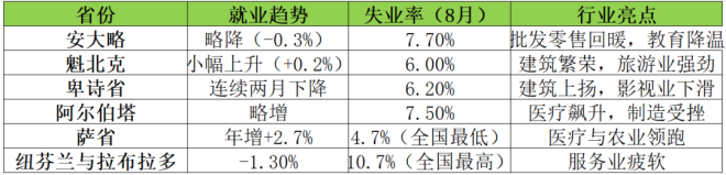 可以看到,加拿大就业的“地图分布”呈现典型的“东西对比”格局——