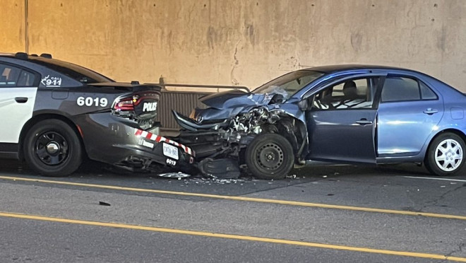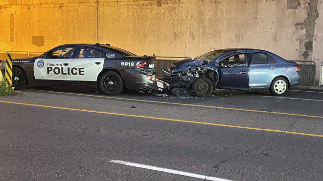 多伦多警方表示,周二凌晨一名警员在北约克调查另一宗时,其警车遭撞击,警员受伤。