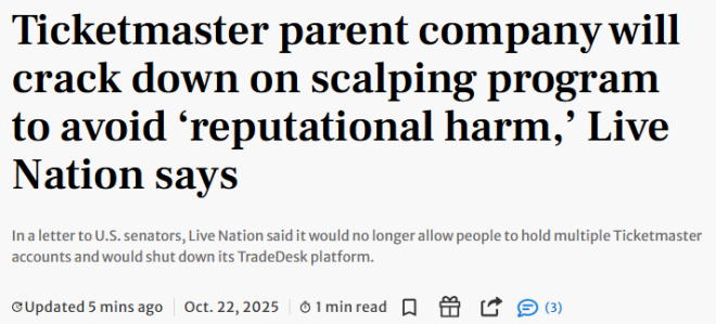 Live Nation在回信中回应称,这些指控“根本不是事实”,他们还反过来说自己是“整个行业里打击黄牛最积极的一家公司”,并强调此次政策调整是为了“避免声誉受损”。