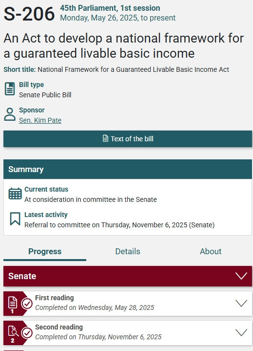 加拿大参议院确实刚刚在二读中通过了 《S-206号法案》,正式迈出建立“全民可维生基本收入(Guaranteed Livable Basic Income)”的第一步。