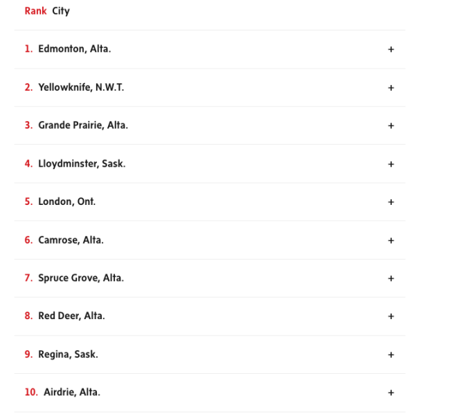 阿省成功包揽了半壁江山,埃德蒙顿拿下全国第一名,但真正令人瞩目的,是跟多伦多的两大都会圈之内,那些面对高租金压力仍能“活得潇洒”的城市。