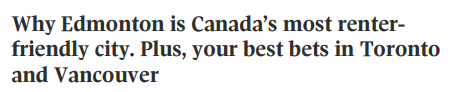 前十之中的六座来自阿省,不仅房租低廉,供应也充裕,中位收入同样相对偏高,生活成本比温哥华或者多伦多低太多。