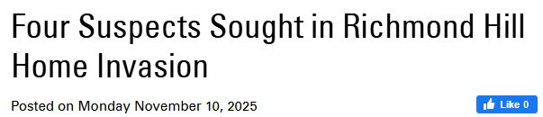 约克区警局正在追查发生在列治文山市的一起入室抢劫案,目前正通缉四名嫌疑人。