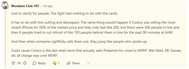 至于事件本身,一位网友透露,此次斗殴的主要原因是插队和不尊重别人。限量卡牌,限量购买,先到先得,而Costco是唯一一家以接近原价出售宝可梦卡牌的零售店。一旦有人插队,结果可想而知。