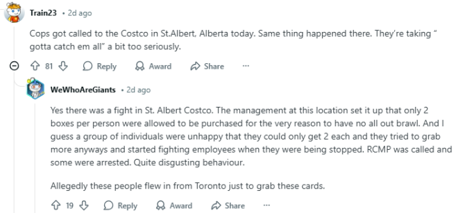 今年,加拿大有多家Costco发生类似事件,从安省到阿省,遍布各地。宝可梦卡牌吸引的不仅仅是卡牌爱好者,还有那些企图转售捞钱的“黄牛”贩子。这些“黄牛”甚至雇人来排队,Costco的限购措施对他们根本不起作用。也正是这些狂热激进的“黄牛”,引发了一起又一起混乱。