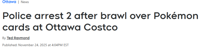 清晨时分,加拿大一家Costco外发生了一场因宝可梦卡牌(Pokémon cards)引发的斗殴,多名成年男子参与其中,令旁观者震惊,最终警方不得不介入。