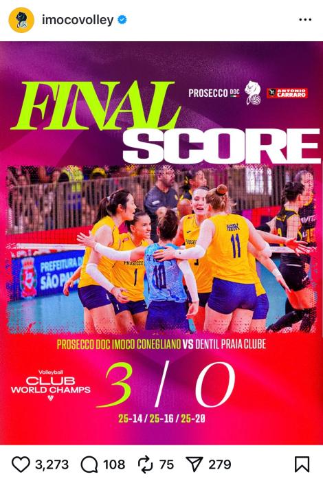 2024年12月,朱婷帮助球队获得女排世俱杯冠军。今年5月,科内利亚诺夺得欧冠冠军,这是朱婷获得的第三个欧冠冠军。