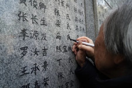 图片 11月30日,南京大屠杀幸存者夏淑琴在“哭墙”上描名。 新华社发 刘臻睿 摄